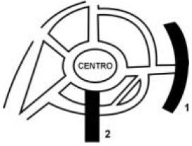 Em certa cidade, algumas de suas principais vias têm a designação “radial” ou “perimetral”, acrescentando-se ao nome da via uma referência ao ponto cardeal correspondente. As ruas 1 e 2 estão indicadas no esquema abaixo, em que não estão explicitados os pontos cardeais.