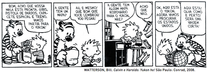 Na tirinha, Calvin e o tigre Haroldo usam um globo terrestre para orientar sua viagem da Califórnia, nos Estados Unidos, para o território do Yukon, no extremo norte do Canadá. Considerando as áreas de origem e destino da viagem pretendida, nota-se que o tigre comete um erro de interpretação no último quadrinho.