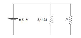 Dois resistores, um de resistência 5,0 Ω e outro de resistência R, estão ligados a uma bateria de 6,0 V e resistência interna desprezível, como mostra a figura.
