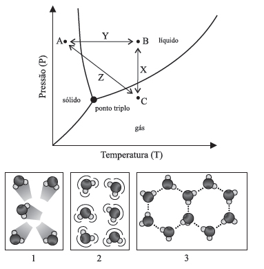 No ciclo da água, mudanças de estado físico são bastante comuns. No diagrama de fases, os pontos A, B e C representam os possíveis estados físicos em que se pode encontrar água em todo o planeta. Neste diagrama, X, Y e Z representam possíveis processos de mudança de estado físico da água, em ambiente natural ou em experimento controlado. As figuras 1, 2 e 3 são representações que podem ser associadas aos pontos A, B e C.