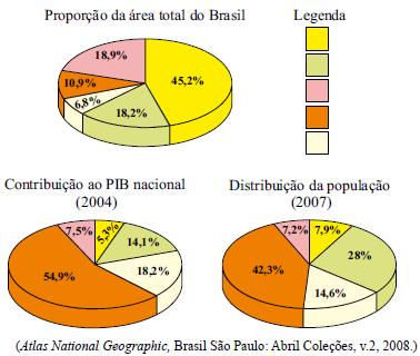 Correlacione, com as regiões brasileiras, as informações contidas nos setogramas (área, PIB, população). Identifique as regiões brasileiras correspondentes a cada item da legenda.