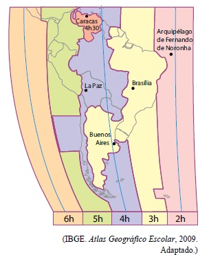 O mapa representa as diferenças de horário na América do Sul em função dos diferentes fusos.