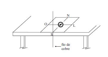 Numa feira de ciências, um estudante montou uma experiência para determinar a intensidade do campo magnético da Terra. Para tanto, fixou um pedaço de fio de cobre na borda de uma mesa, na direção vertical. Numa folha de papel, desenhou dois segmentos de retas perpendiculares entre si e colocou uma bússola de maneira que a direção Norte-Sul coincidisse com uma das retas, e o centro da bússola coincidisse com o ponto de cruzamento das retas. O papel com a bússola foi colocado sobre a mesa de forma que a linha orientada na direção Norte-Sul encostasse no fio de cobre. O fio foi ligado a uma bateria e, em função disso, a agulha da bússola sofreu uma deflexão. A figura mostra parte do esquema da construção e a orientação das linhas no papel.