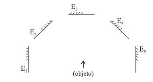 A figura representa um objeto e cinco espelhos planos, E1,E2, E3, E4 e E5.