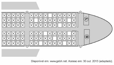 Uma família composta por sete pessoas adultas, após decidir o itinerário de sua viagem, consultou o site de uma empresa aérea e constatou que o voo para a data escolhida estava quase lotado. Na figura, disponibilizada pelo site, as poltronas ocupadas estão marcadas com X e as únicas poltronas disponíveis são as mostradas em branco.