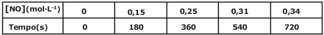 Admita a variação de concentração em mol por litro (mol·L-1) do monóxido de nitrogênio (NO) em função do tempo em segundos (s), conforme os dados, da tabela abaixo: