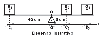O cubo com centro de massa em G2 possui peso igual a 4P1 e o cubo com centro de massa em G3 possui peso igual a 2P1. A projeção ortogonal dos pontos G1, G2, G3 e O sobre a reta r paralela à barra são, respectivamente, os pontos C1, C2, C3 e O’. A distância entre os pontos C1 e O’ é de 40 cm e a distância entre os pontos C2 e O’ é de 6 cm. Nesta situação, a distância entre os pontos O’ e C3 representados no desenho, é de: