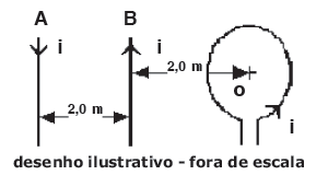 Dois fios “A” e “B” retos, paralelos e extensos, estão separados por uma distância de 2 m. Uma espira circular de raio igual a π/4 m encontra-se com seu centro “O” a uma distância de 2 m do fio “B” conforme desenho abaixo. A espira e os fios são coplanares e se encontram no vácuo. Os fios “A” e “B” e a espira são percorridos por correntes elétricas de mesma intensidade i= 1 A com os sentidos representados no desenho. A intensidade do vetor indução magnética resultante originado pelas três correntes no centro “O” da espira é: