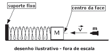 Um bloco de massa M=180 g está sobre uma superfície horizontal sem atrito, e prende-se à extremidade de uma mola ideal de massa desprezível e constante elástica igual a 2 · 103 N/m. A outra extremidade da mola está presa a um suporte fixo, conforme mostra o desenho. Inicialmente o bloco se encontra em repouso e a mola no seu comprimento natural, isto é, sem deformação.