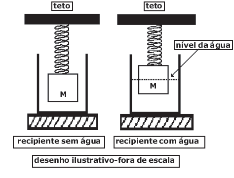 No interior de um recipiente vazio, é colocado um cubo de material homogêneo de aresta igual a 0,40 m e massa M=40 kg. O cubo está preso a uma mola ideal, de massa desprezível, fixada no teto de modo que ele fique suspenso no interior do recipiente, conforme representado no desenho abaixo. A mola está presa ao cubo no centro de uma de suas faces e o peso do cubo provoca uma deformação de 5 cm na mola. Em seguida, coloca-se água no recipiente até que o cubo fique em equilíbrio com metade de seu volume submerso. Sabendo que a densidade da água é de 1000 kg/m3 , a deformação da mola nesta nova situação é de Dado: intensidade da aceleração da gravidade g=10 m/s2