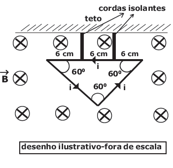 Em uma espira condutora triangular equilátera, rígida e homogênea, com lado medindo 18 cm e massa igual a 4,0 g, circula uma corrente elétrica i de 6,0 A, no sentido anti-horário. A espira está presa ao teto por duas cordas isolantes, ideais e de comprimentos iguais, de modo que todo conjunto fique em equilíbrio, num plano vertical. Na mesma região, existe um campo magnético uniforme de intensidade B=0,05 T que atravessa perpendicularmente o plano da espira, conforme indicado no desenho abaixo.