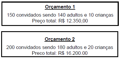 Um casal está pesquisando preços para sua festa de casamento e tem em mãos dois orçamentos, que foram fornecidos por um mesmo Buffet: