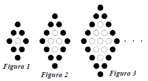 “A figura 1 é composta por 1 bola branca cercada por 8 bolas pretas. A figura 2, 4 bolas brancas cercadas por 12 bolas pretas e assim por diante.”