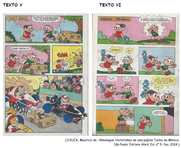 A partir da leitura das duas histórias em quadrinhos apresentadas (TEXTOS V e VI) e do seu conhecimento de mundo, escolha a afirmativa correta.