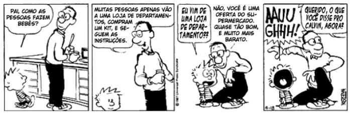 Na tirinha de Calvin, temos a fala de uma personagem cuja imagem não nos é mostrada. Entretanto, essa fala nos revela bastante sobre as relações do núcleo familiar ali presente, sobre o qual deduzimos que:
