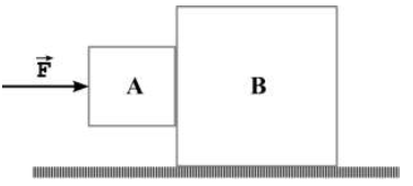 Os blocos A e B devem ser movimentados conforme mostrado na figura abaixo, sem que o bloco menor deslize para baixo (os blocos não estão presos um ao outro). Há atrito entre o bloco A, de massa 8,00 kg, e o bloco B, de massa 40,0 kg, sendo o coeficiente de atrito estático 0,200. Não havendo atrito entre o bloco B e o solo, a intensidade mínima da força externa F , em newtons, deve ser igual a
