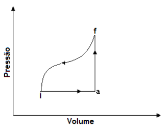 Um gás ideal realiza o ciclo mostrado na figura. O sistema é levado do estado inicial (i) para o estado final (f) ao longo da trajetória indicada. Considere Ei = 5cal e que para o percurso iaf Q = 13 cal e W=3 cal. Sabendo que, no percurso de f até i, o trabalho realizado é igual a 7 cal, o calor transferido para essa trajetória é igual a