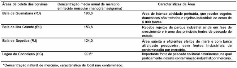Segundo a legislação brasileira, o limite máximo permitido para as concentrações de mercúrio total é de 500 nanogramas por grama de peso úmido. Ainda levando em conta os dados da tabela e o tipo de circulação do mercúrio ao longo da cadeia alimentar, pode-se considerar que a ingestão, pelo ser humano, de corvinas capturadas nessas regiões,TEMPO NA QUESTÃO