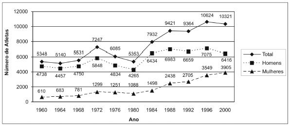 O número de atletas nas Olimpíadas vem aumentando nos últimos anos, como mostra o gráfico. Mais de 10.000 atletas participaram dos Jogos Olímpicos de Sydney, em 2000.
