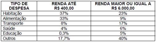 Uma pesquisa sobre orçamentos familiares, realizada recentemente pelo IBGE, mostra alguns itens de despesa na distribuição de gastos de dois grupos de famílias com rendas mensais bem diferentes.