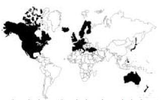 No mapa seguinte, estão destacados, com a cor preta, os países que mais receberam esses fluxos migratórios em 2002. As migrações citadas estão relacionadas, principalmente, à