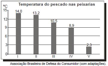 Uma das principais causas da degradação de peixes frescos é a contaminação por bactérias. O gráfico apresenta resultados de um estudo acerca da temperatura de peixes frescos vendidos em cinco peixarias. O ideal é que esses peixes sejam vendidos com temperaturas entre 2 ºC e 4 ºC. Selecionando-se aleatoriamente uma das cinco peixarias pesquisadas, a probabilidade de ela vender peixes frescos na condição ideal é igual aTEMPO NA QUESTÃO
