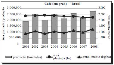 No gráfico a seguir, estão especificados a produção brasileira de café, em toneladas; a área plantada, em hectares (ha); e o rendimento médio do plantio, em kg/ha, no período de 2001 a 2008.