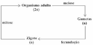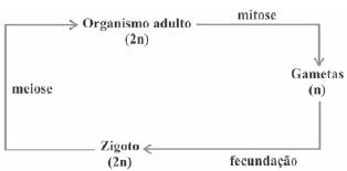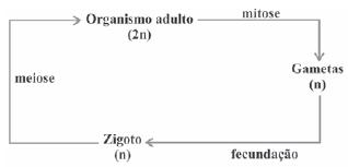 Os seres vivos apresentam diferentes ciclos de vida, caracterizados pelas fases nas quais gametas são produzidos e pelos processos reprodutivos que resultam na geração de novos indivíduos. Considerando-se um modelo simplificado padrão para geração de indivíduos viáveis, a alternativa que corresponde ao observado em seres humanos é:
