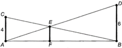 O dono de um sítio pretende colocar uma haste de sustentação para melhor firmar dois postes de comprimentos iguais a 6m e 4m. A figura representa a situação real na qual os postes são descritos pelos segmentos AC e BD e a haste é representada pelo EF, todos perpendiculares ao solo, que é indicado pelo segmento de reta AB. Os segmentos AD e BC representam cabos de aço que serão instalados.