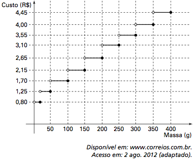 Deseja-se postar cartas não comerciais, sendo duas de 100g, três de 200g e uma de 350g. O gráfico mostra o custo para enviar uma carta não comercial pelos Correios: