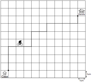 A Secretaria de Saúde de um município avalia um programa que disponibiliza, para cada aluno de uma escola municipal, uma bicicleta, que deve ser usada no trajeto de ida e volta, entre sua casa e a escola. Na fase de implantação do programa, o aluno que morava mais distante da escola realizou sempre o mesmo trajeto, representado na figura, na escala 1:25 000, por um período de cinco dias.