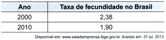 A taxa de fecundidade é um indicador que expressa a condição reprodutiva média das mulheres em uma região, e é importante para uma análise da dinâmica demográfica dessa região. A tabela apresenta os dados obtidos pelos Censos de 2000 e 2010, feitos pelo IBGE, com relação à taxa de fecundidade no Brasil.