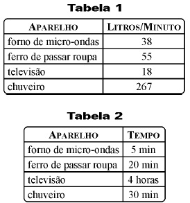 A produção de energia elétrica no Brasil depende quase totalmente das usinas hidrelétricas. A tabela 1 mostra a quantidade média de litros de água que devem passar pelas turbinas das hidrelétricas para o funcionamento de alguns aparelhos domésticos. A tabela 2 mostra o tempo médio diário de uso desses aparelhos nas residências brasileiras.
