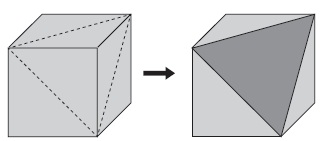 Um cubo maciço é cortado por um plano segundo as linhas tracejadas, como mostra a figura abaixo.