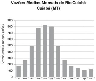 O gráfico apresenta a distribuição das vazões médias mensais do rio Cuiabá, na cidade de Cuiabá, ao longo de um ano.