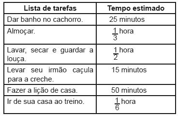 João Paulo chegou da escola às 13h e encontrou a lista detalhada de tarefas deixada por sua mãe, como mostra a tabela a seguir. Ele precisa cumprir essa lista antes de ir para o treino de futebol que começará às 16h.