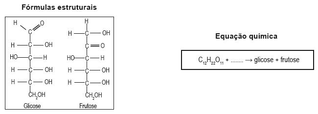 Observe as fórmulas estruturais desses monossacarídeos e a equação química, a ser completada, que permite obtê-los a partir da sacarose.