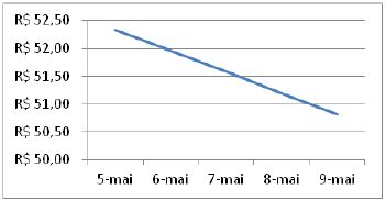 Sabendo que o preço em 5/5/2014 era R$ 52,34 e, em 9/5/2014, era R$ 50,82, o valor de cada ação da empresa X, no dia 6/5/2014, correspondia a: