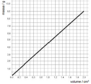 Analisando-se esse gráfico, conclui-se que a densidade do metal em questão é, em g/cm3, igual a aproximadamente