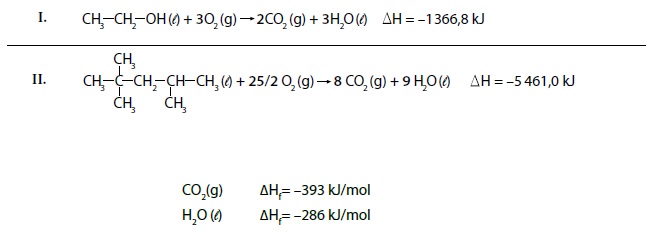 Dadas as entalpias de formação dos compostos, conclui-se, corretamente, que a entalpia de formação do combustível presente em I é, em kJ/mol,