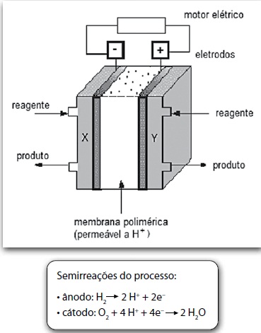 Os motores de combustão são frequentemente responsabilizados por problemas ambientais, como a potencialização do efeito estufa e da chuva ácida, o que tem levado pesquisadores a buscar outras tecnologias. Uma dessas possibilidades são as células de combustíveis de hidrogênio que, além de maior rendimento, não poluem. Observe o esquema: