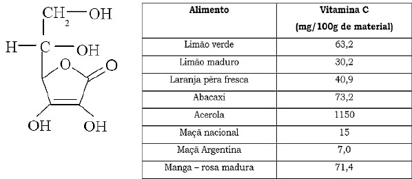 Considere o texto, a fórmula estrutural da vitamina C e o quadro a seguir.