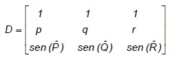 na qual p, q e r são lados de um triangulo cujos ângulos opostos são, respectivamente P, Q e R. O valor do determinante de D é:
