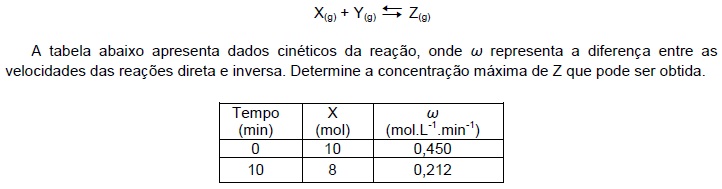 A um reator isotérmico com capacidade de 100 L são adicionados 10 mols do gás X e 15 mols do gás Y, ocorrendo formação do gás Z segundo a reação elementar