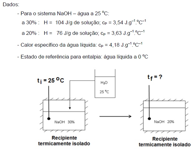 Considere um recipiente adiabático conforme a ilustração abaixo, no qual 1000 g de uma solução aquosa de NaOH, a 30% em massa, e a uma temperatura inicial ti = 25 °C, são diluídos a 20% em massa, com água à mesma temperatura. Calcule a temperatura tf da solução após a diluição.
