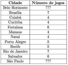 Na 1a fase, haverá oito grupos com quatro seleções em cada um, devendo cada seleção enfrentar uma única vez todos os integrantes do seu grupo. Na fase de oitavas de final, cada uma das 16 equipes classificadas jogará uma única vez, o mesmo ocorrendo nas quartas de final com as oito equipes classificadas. Depois disso, restarão ainda quatro jogos (semifinais, disputa de 3o lugar e final) para definir o campeão mundial. Sabendo que São Paulo e Belo Horizonte abrigarão o mesmo número de jogos, conclui-se que haverá, em cada uma dessas duas cidades, um total de
