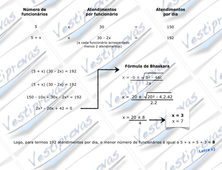 Quando 5 funcionários trabalham simultaneamente numa repartição pública, cada um consegue atender, em média, 30 pessoas por dia. Assim, em um dia, são atendidas 150 pessoas no total. Aumentando-se o número de funcionários na repartição, o número médio de atendimentos cai, pois os funcionários passam a ter de dividir os recursos físicos (computadores, arquivos, mesas, etc), fazendo com que o tempo de cada atendimento aumente. Estima-se que, a cada funcionário adicional que passe a trabalhar na repartição, a média de atendimentos diários por funcionário caia 2 pessoas.