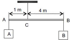 Em uma experiência, a barra homogênea, de secção reta constante e peso 100 N, é suspensa pelo seu ponto C, por um fio ideal, e mantida em equilíbrio como mostra a figura. Nas extremidades da barra, são colocados os corpos A e B. Sabe-se que o peso do corpo B é 80 N. A tração no fio que sustenta essa barra tem intensidade