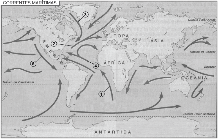 INSTRUÇÃO: Para resolver a questão 11, observe a identificação numérica das principais correntes oceânicas no mapa, e o enunciado.