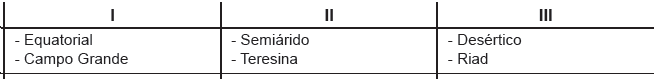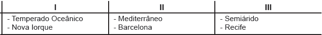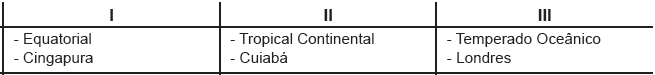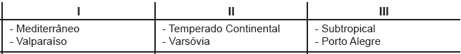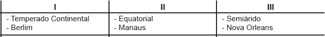 Os climas representados por I, II e III e as respectivas cidades estão corretamente indicados em: